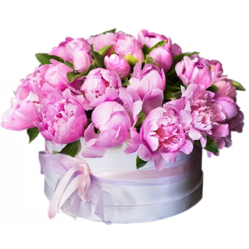 Букет состоит из 31 розовый пион, зелень, коробка, атласная лента, оазис.